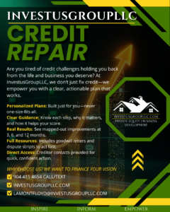 At Investus Group LLC, we know strong credit isn’t just a number—it’s the key to financial freedom, better opportunities, and peace of mind. Whether you’re preparing for a major purchase, seeking business funding, or simply wanting a fresh start, our credit repair services are designed to help you take control.